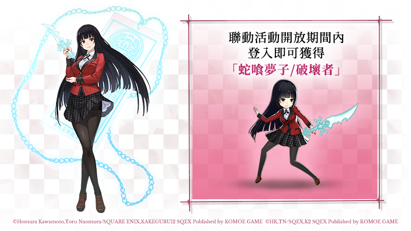 於5月12日~5月26日活動期間登入《死亡愛麗絲》繁中版的玩家,即可免費獲得《狂賭之淵》的聯動角色「蛇喰夢子/破壞者」,也就是那個轉學到私立百花王學園的黑髮少女,為賭而狂的女人!該職業可於禮物箱中領取,每個帳號僅限領取一次。