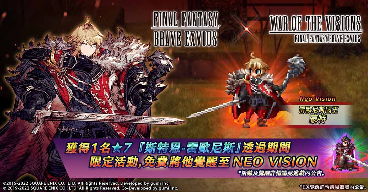 今 (2022/5/13) gumi Inc.對外宣布,由發行商SQUARE ENIX®,以及其合作夥伴開發商gumi Inc.聯手推出的超人氣RPG手機遊戲《FINAL FANTASY® BRAVE EXVIUS®》國際版(以下簡稱《FFBE》國際版),全球下載數突破4,500萬!與《WAR OF THE VISIONS™ FINAL FANTASY BRAVE EXVIUS®》國際版(以下譯稱《FFBE 幻影戰爭》國際版)的全新合作活動正式開跑!《FFBE 幻影戰爭》代表性人物『雷歐尼斯國王蒙特』等,已化身為《FFBE》中的幻兵!除了新角色外,還有眾多合作活動、「WOTV FFBE 每日免費召喚」,以及豪華的登入獎勵,只要輕鬆登入遊戲,即可免費獲得1名★7兵員『斯特恩·雷歐尼斯』!