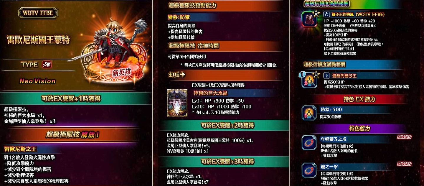 即日起,於活動期間您將可透過精選召喚,邀請《FFBE 幻影戰爭》合作活動兵員『雷歐尼斯國王蒙特』、『維內拉·芬尼斯』,與『斯特恩·雷歐尼斯』加入您的隊伍!