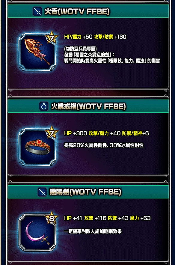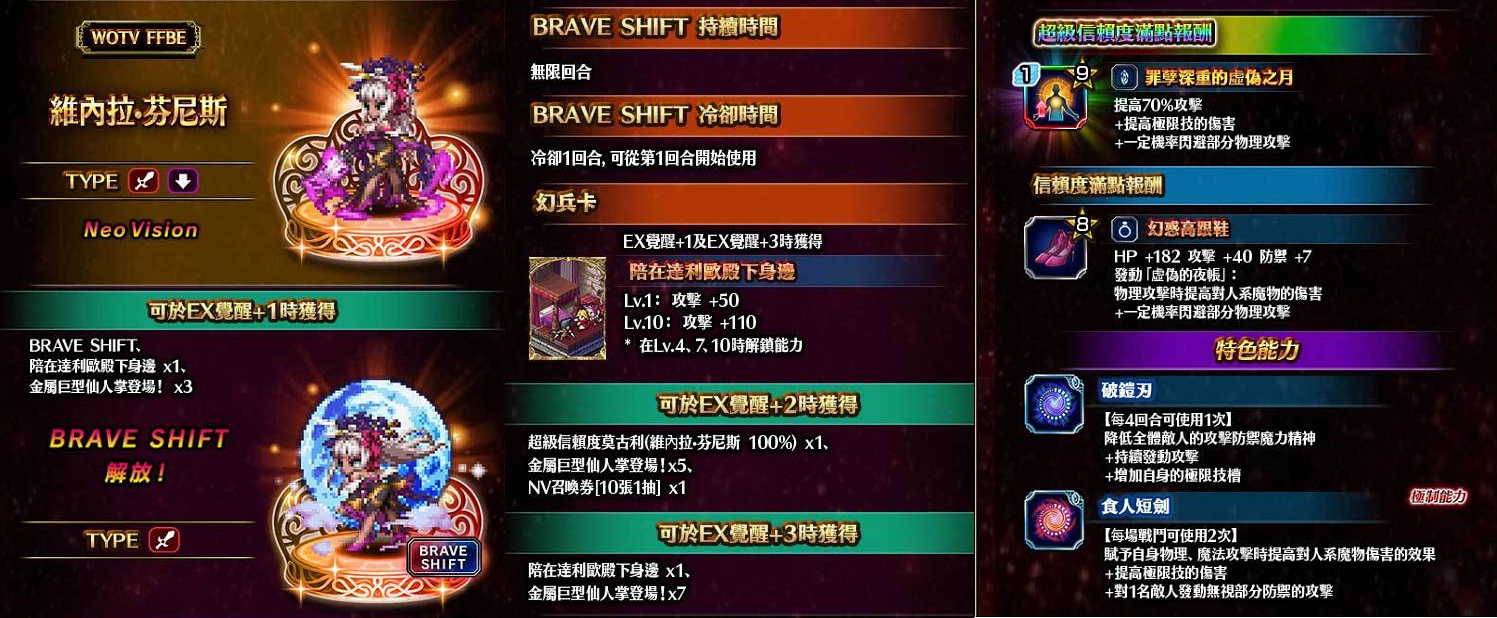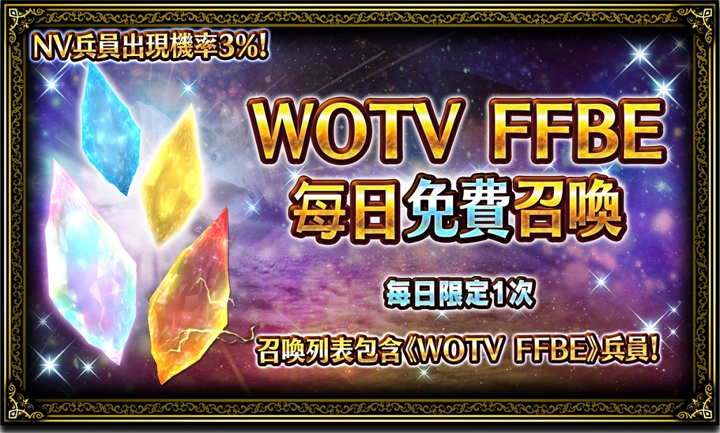 - 「WOTV FFBE 每日免費召喚」:即日起至5/26活動時間止,玩家們可以進行1次每日召喚,獲得1名★3以上/NV兵員, NV兵員出現機率3%!此外召喚列表包含《FFBE 幻影戰爭》兵員。