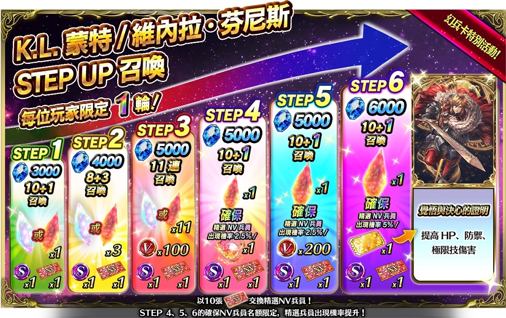 - 『K.L.蒙特/維內拉·芬尼斯』STEP UP召喚:新英雄『雷歐尼斯國王蒙特』與『維內拉·芬尼斯』參戰!立即透過這個全新的精選召喚,邀請他們與你一同戰鬥!還可以於每一個STEP獲得1個「召喚硬幣(K.L.蒙特/維內拉·芬尼斯)」,並在STEP 6確保獲得一張幻兵卡交換券(覺悟與決心的證明)!STEP4、5、6的確保NV兵員名額限定,精選兵員出現機率提升!此外,玩家可使用10張「NV交換券(K.L.蒙特/維內拉·芬尼斯)」,交換精選NV兵員!以及使用「交換券(覺悟與決心的證明)」,交換幻兵卡「覺悟與決心的證明」!