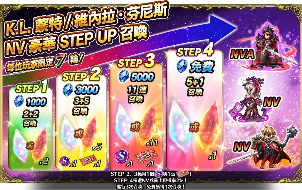 - 『K.L.蒙特/維內拉·芬尼斯』NV豪華STEP UP召喚:即日起至5/26活動時間結束止,玩家可以透過此召喚於STEP2、3獲得1個「召喚硬幣(K.L.蒙特/維內拉·芬尼斯)」,以及1張「NV交換券(K.L.蒙特/維內拉·芬尼斯)」,於STEP4精選NV兵員出現機率2%!當玩家們完成此召喚的STEP 1至3,將可免費進行STEP 4!