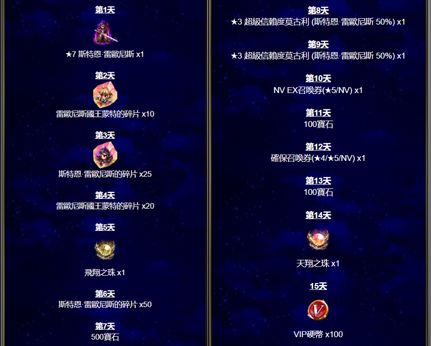 - 「移動的蒙太奇登入獎勵」:即日起至5/27活動時間結束止,玩家可以於登入的第一天,獲得可覺醒至Neo Vision的★7兵員『斯特恩·雷歐尼斯』,另外只要每日持續登入遊戲,就可以獲得『斯特恩·雷歐尼斯』的覺醒素材,以及1張NV EX召喚券(★5/NV),與1張確保召喚券(★4/★5/NV) x1等眾多珍貴報酬。