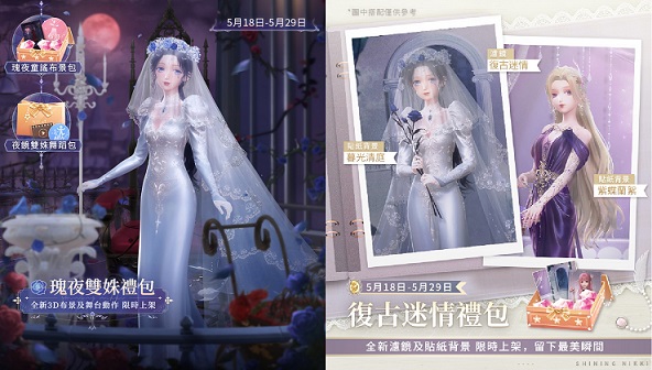 此外,5月18日至5月29日期間,「月吟花束」系列超值禮包在商城推薦-緋月之影頁面限時上架,含氛圍「緋紅夜魘」「銀白月影」、粉鑽及星鑽禮包;夜鏡雙姝舞蹈包、瑰夜童謠布景包及復古迷情禮包限時上架:夜鏡雙姝舞蹈包含全新變裝舞台動作「夜鏡雙姝」、粉鑽等,瑰夜童謠布景包含3D可互動布景「瑰夜童謠」及靜態布景「馥月花柱」「緋紅之座」「謐月燭台」、粉鑽等,復古迷情禮包:含全新濾鏡「復古迷情」、貼紙背景「紫蝶蘭絮」「暮光清庭」及粉鑽。超值特惠,限購1次,供有需要的玩家選購。