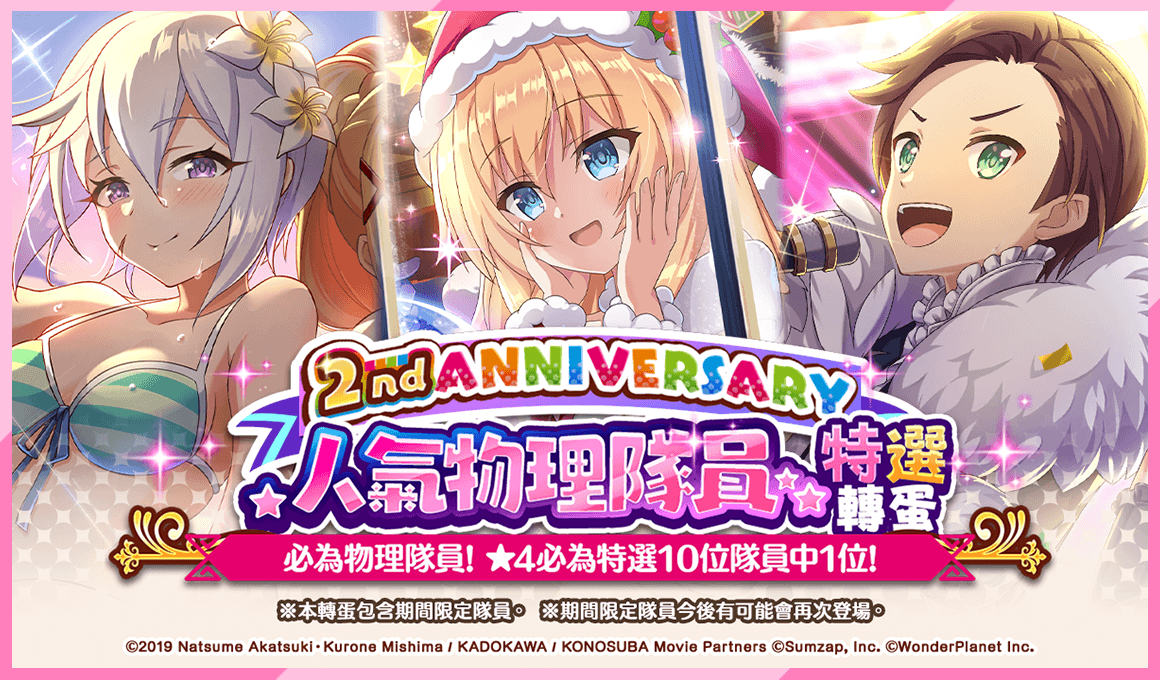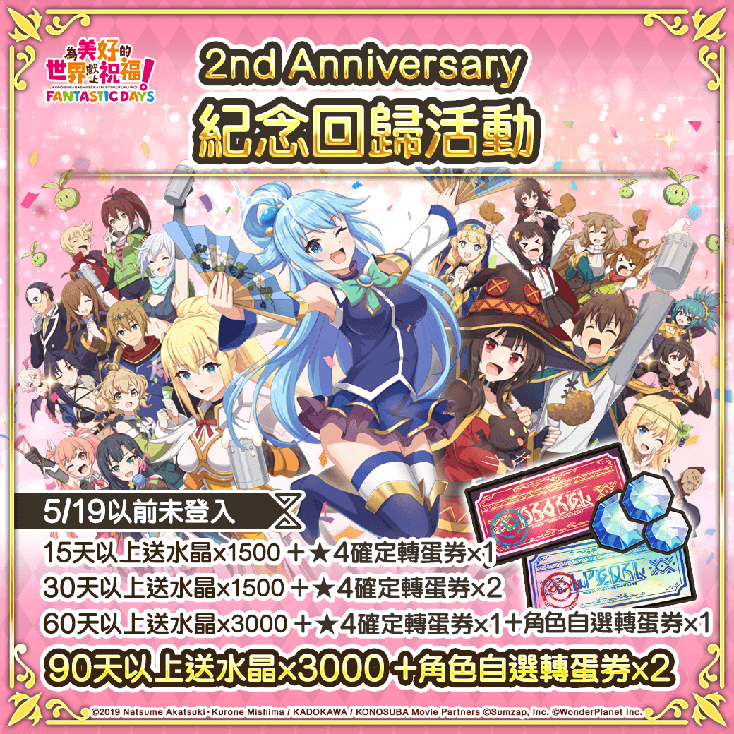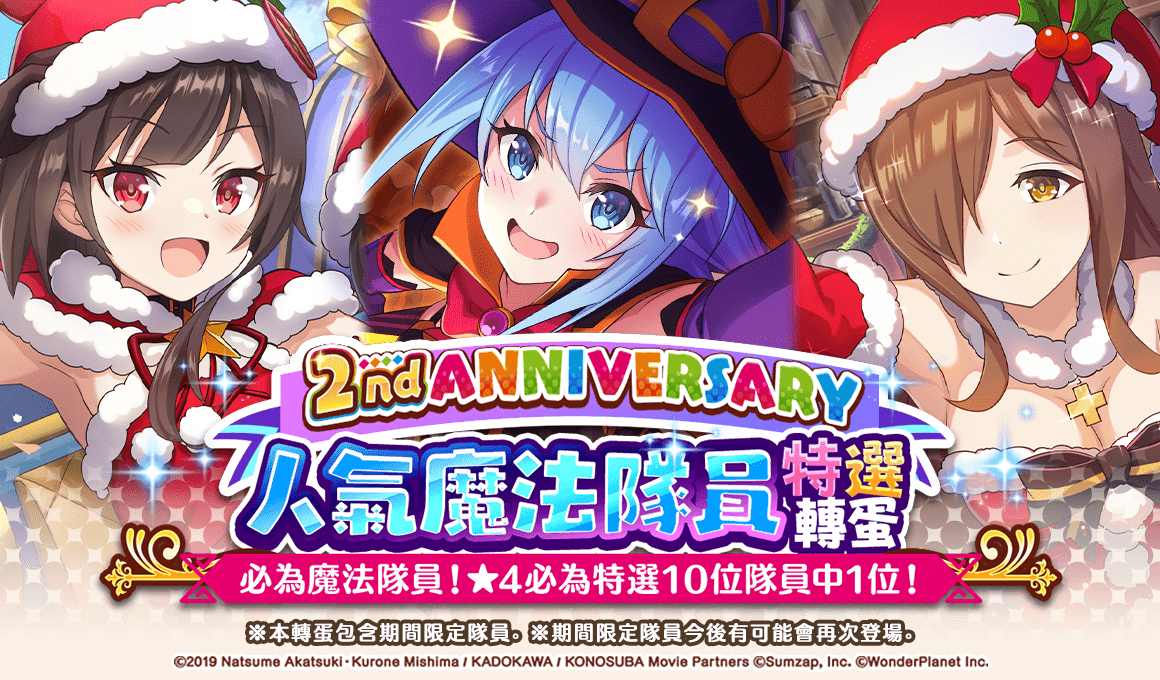 致力發展數位娛樂服務的 WonderPlanet Inc. (所在地:日本,總公司:愛知縣名古屋市,CEO:常川友樹,東證Growth:證券代碼4199,以下簡稱「本公司」),由本公司發行及營運,改編自人氣動畫『為美好的世界獻上祝福!』首款手機遊戲『為美好的世界獻上祝福!Fantastic Days』(以下簡稱『美好世界FD』),將於2022年5月19日(四)起舉辦「2nd Anniversary前夜祭活動」,特此告知。