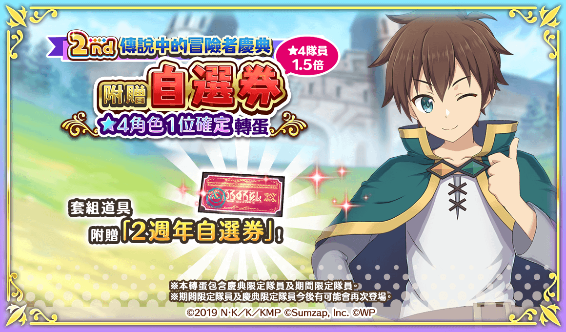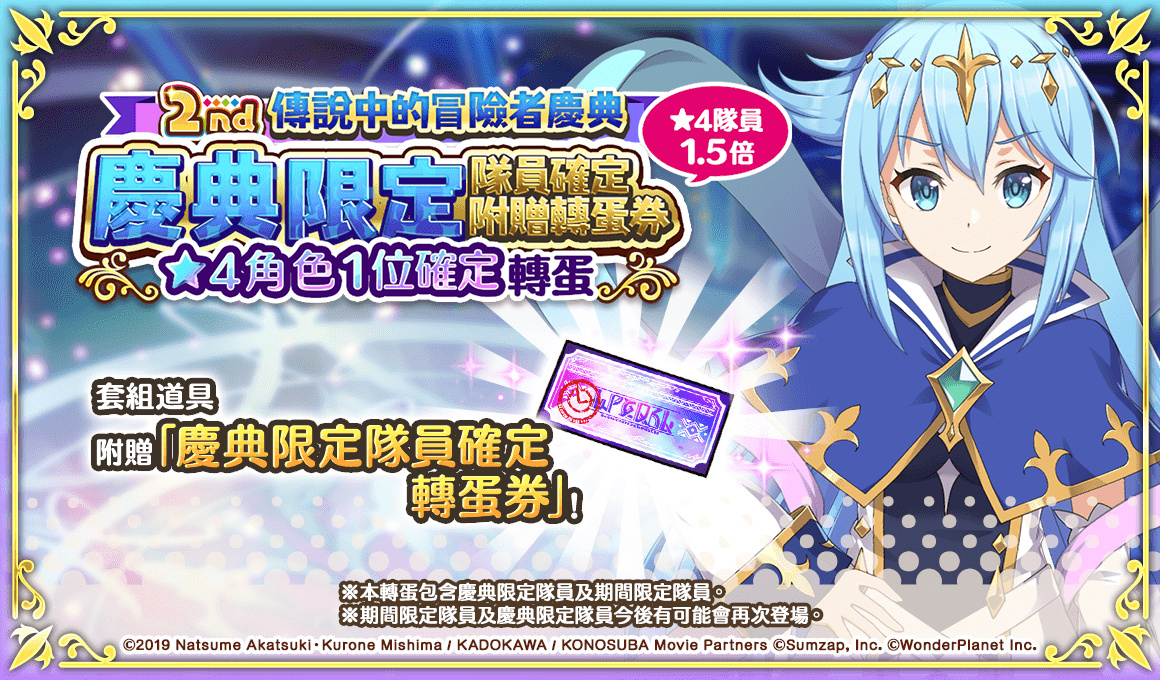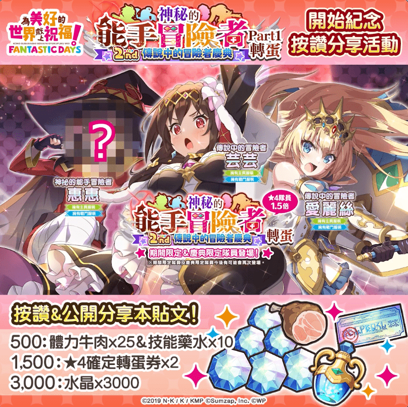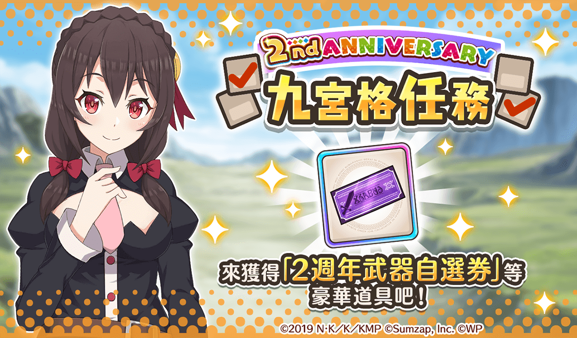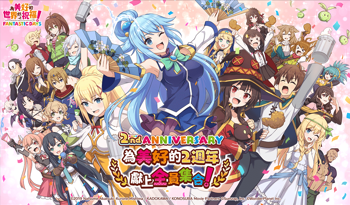 致力發展數位娛樂服務的 WonderPlanet Inc. (所在地:日本,總公司:愛知縣名古屋市,CEO:常川友樹,東證Growth:證券代碼4199,以下簡稱「本公司」),由本公司發行及營運,改編自人氣動畫『為美好的世界獻上祝福!』首款手機遊戲『為美好的世界獻上祝福!Fantastic Days』(以下簡稱『美好世界FD』),將於2022年5月25日(三)起舉辦「日版2nd Anniversary活動」,特此告知。