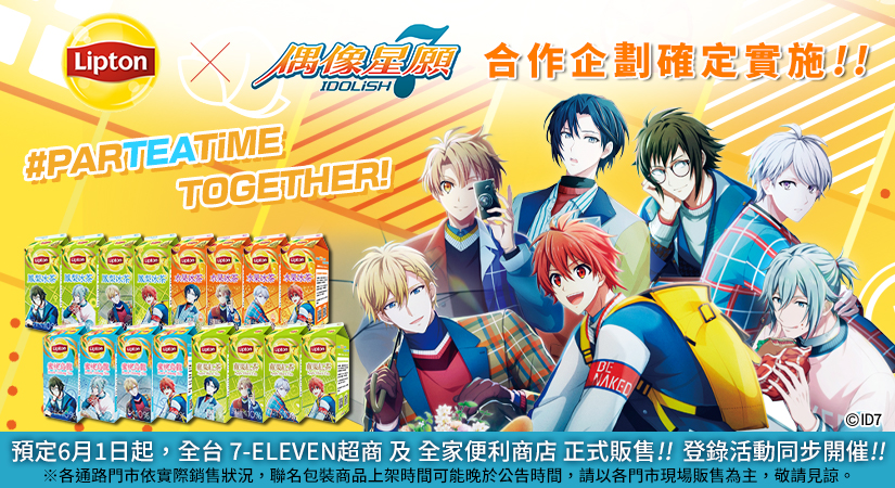 偶像團體IDOLiSH7近期續任日本Lipton品牌大使;今(30)日接力宣布與台灣立頓Lipton合作!IDOLiSH7團員七瀨陸、和泉一織、二階堂大和、和泉三月、四葉環、逢坂壯五、六彌凪等7位偶像的魅力身姿,結合立頓水果茶的清爽酸甜,共16款聯名包裝,將在台灣地區指定通路上市,等待粉絲一一收集♪