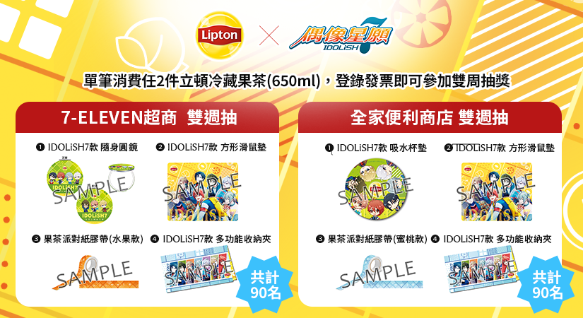 立頓Lipton聯名果茶於全台指定通路進行販售,活動期間內持消費憑證可至立頓Lipton活動特設網頁登錄發票號碼、參加7-ELEVEN超商及全家便利商店的雙周累積抽獎;有機會獲得《IDOLiSH7-偶像星願-》X 立頓Lipton合作紀念週邊!詳細參加辦法可至立頓Lipton活動特設網頁查詢。