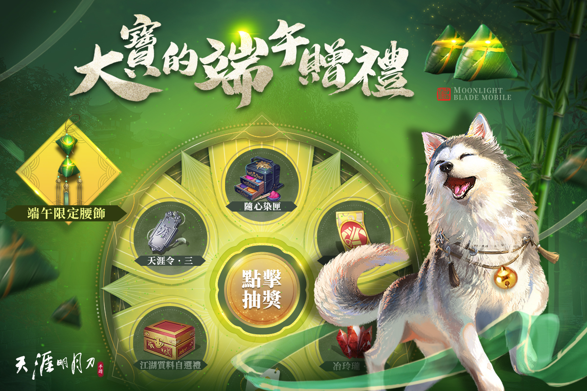 『天刀M生日宴』第一波活動將搭配端午佳節,推出大寶的『端午贈禮』活動,於 6 月 03 日至 6 月 16 日期間,在遊戲內完成指定任務,除了可以獲得「天涯令‧三」、「隨心染匣」、「神俠招募令」與「江湖質料自選禮」…等珍貴虛寶外,完成六個獎池自選禮後,還能免費獲得時裝端午腰飾「香切玉」,和各位少俠一起度過美好的端午佳節。