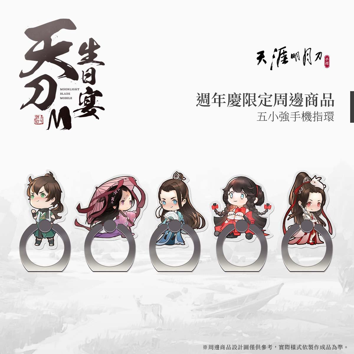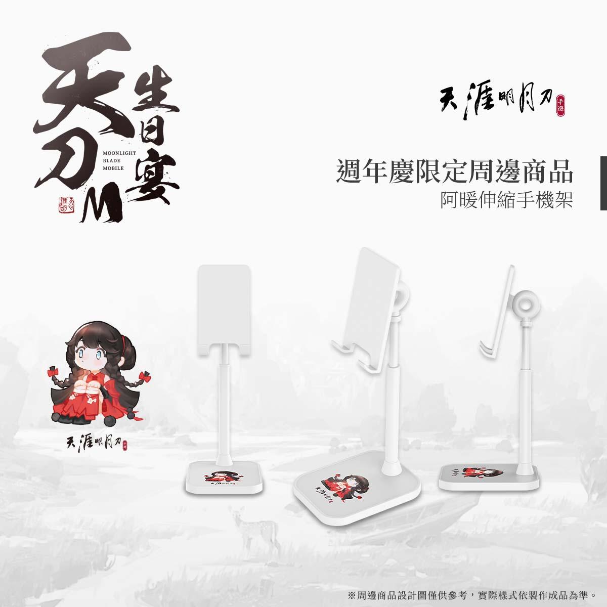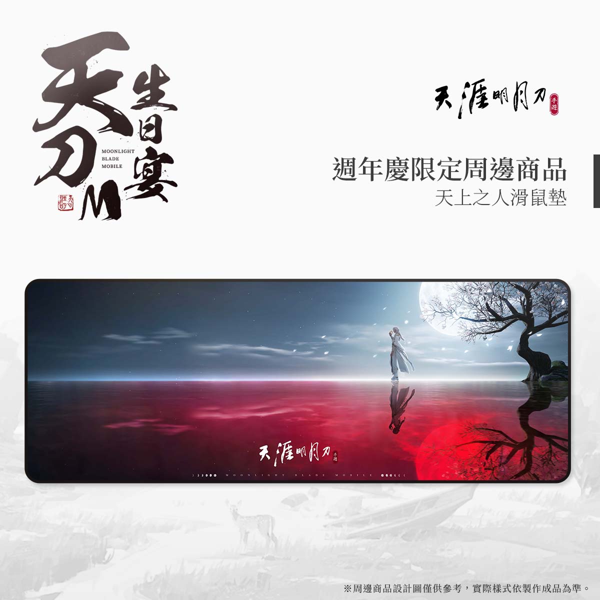 為了感謝各位少俠一年來的支持,官方特別規劃了為期一個月的週年特輯活動,每階段活動除了送出讓少俠們拿到手軟的珍稀虛寶、綁點與趣味稱號外,參加活動還有機會獲得一週年紀念周邊商品「天上之人滑鼠墊」、「五小強手機指環」與「阿暖伸縮手機架」, 想要獲得《天涯明月刀 M》周邊商品的少俠們,千萬不能錯過『天刀M生日宴』的精彩活動!