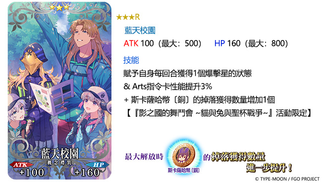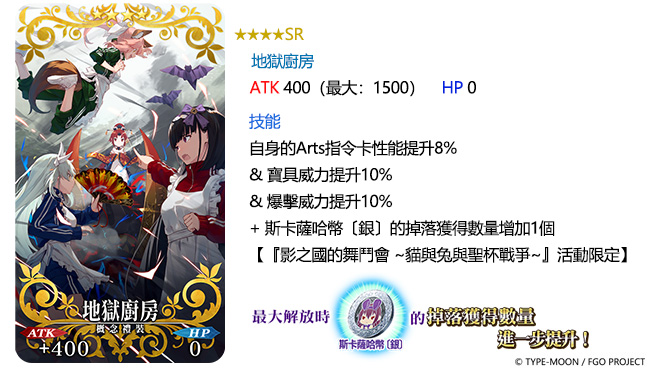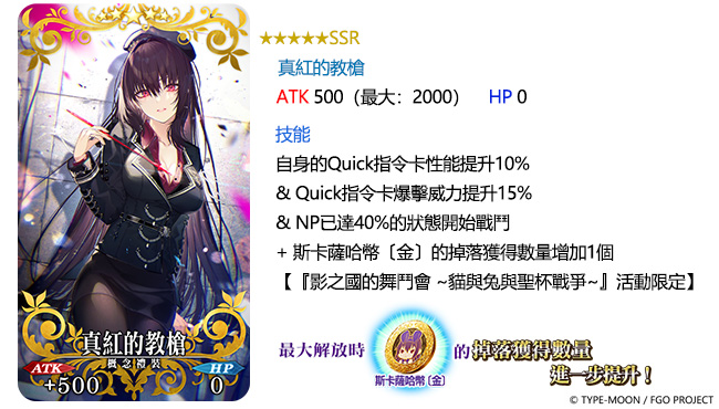 挑戰本次活動「影之國的舞鬥會 ~貓與兔與聖杯戰爭~」時,裝備「★5(SSR)真紅的教槍」、「★4(SR)地獄廚房」及「★3(R)藍天校園」等三款概念禮裝,除了擁有既有的技能效果,還能提升機率掉落的「斯卡薩哈幣〔金〕」、「斯卡薩哈幣〔銀〕」及「斯卡薩哈幣〔銅〕」等活動道具數量。