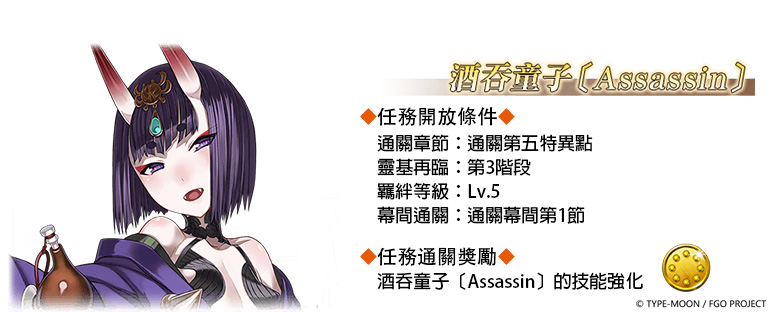 此外,同日開放的「幕間物語紀念活動第14彈PICK UP召喚」中,將有「★5(SSR)酒吞童子〔Assassin〕」、「★4(SR)阿塔蘭塔〔Alter〕」、「★3(R)赤兔馬」及「★3(R)阿維斯布隆」等多位人氣從者登場。