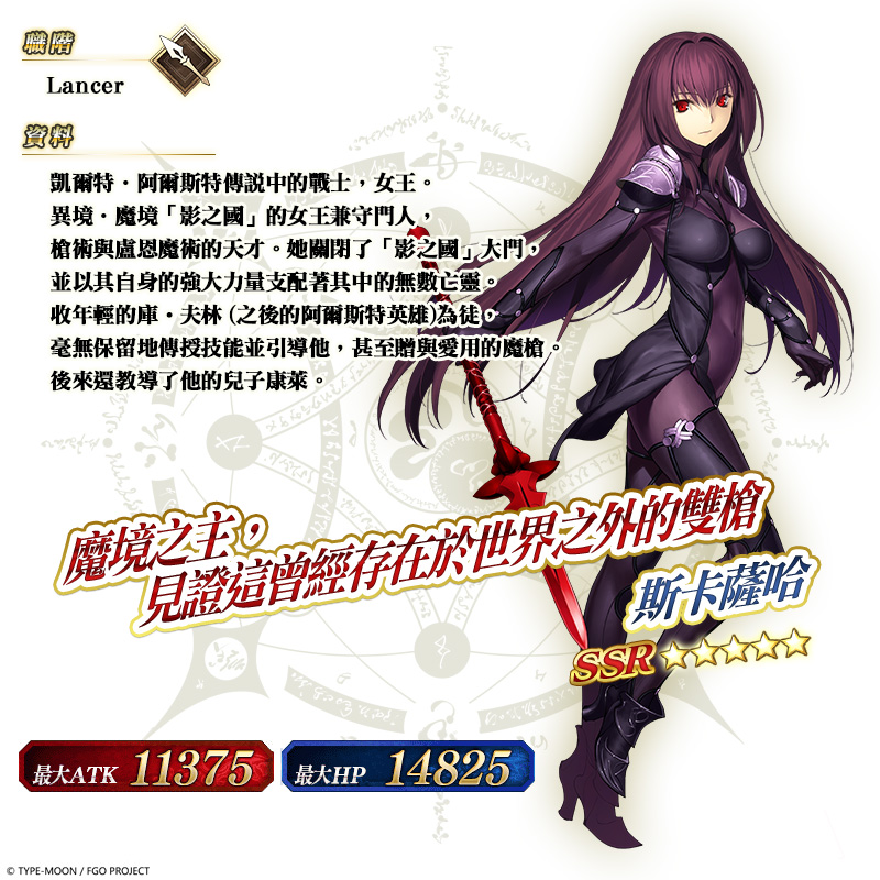 神代英靈.斯卡薩哈,不單為御主準備特別課程、充實作戰經驗,也將在「影之國的舞鬥會PICK UP召喚(每日變更)」中登場。自2022年6月16日(四)維護後,通關永久開放「★5(SSR)斯卡薩哈〔Lancer〕」特別任務,將強化斯卡薩哈〔Lancer〕的技能「原初的盧恩」。