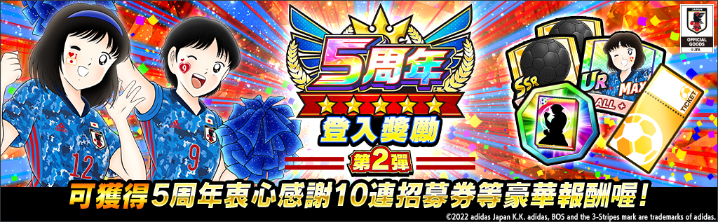 《足球小將翼:夢幻隊伍》已在6月13日迎來遊戲推出5周年。在「5周年活動第2彈」中,除了有穿著尤文圖斯正式比賽隊服的薩瓦多雷・尚帝雷、羅曼・巴卡斯、特瑞薩加登場的「JUVENTUS選拔招募 第2彈」之外,也持續進行「JUVENTUS OFFICIAL CAMPAIGN:全體玩家贈禮」、最多500連免費的「5周年 : 衷心感謝 10連票券招募」、可獲得夢球50個與「5周年:選擇式SSR確定招募券」的「5周年 : 感恩好禮!」活動。