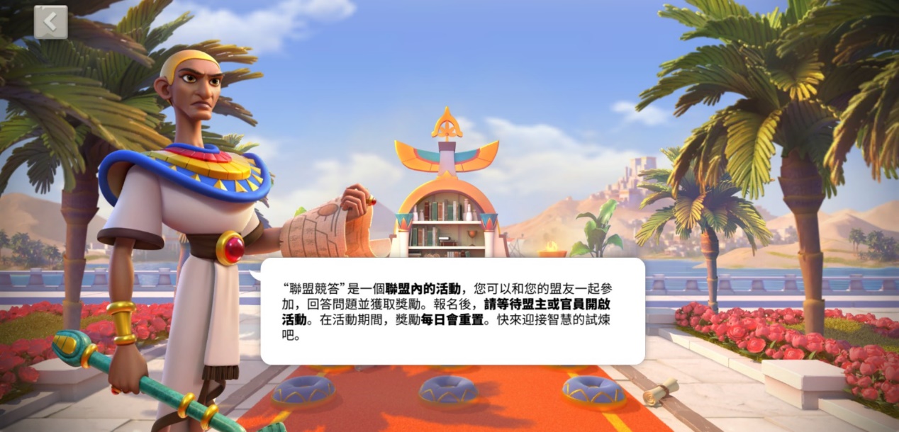 本次大改版舉行埃及主題福利活動「洗淨沙塵的文明」!透過「永恆篇章」,玩家可以跟隨吉爾伽美什,探索神祕埃及文明,尋找永恆的真諦。觀賞精彩敘事劇情,即可獲得限定頭像框與豐富道具好禮。別忘了每天至「簽到大回饋」完成簽到,就有埃及傳說統帥「圖特摩斯三世」與多重獎勵送給你。除此之外,還有趣味問答活動「聯盟競答」,與盟友一同回答問題,累積聯盟得分,解鎖更豐厚的獎勵吧!