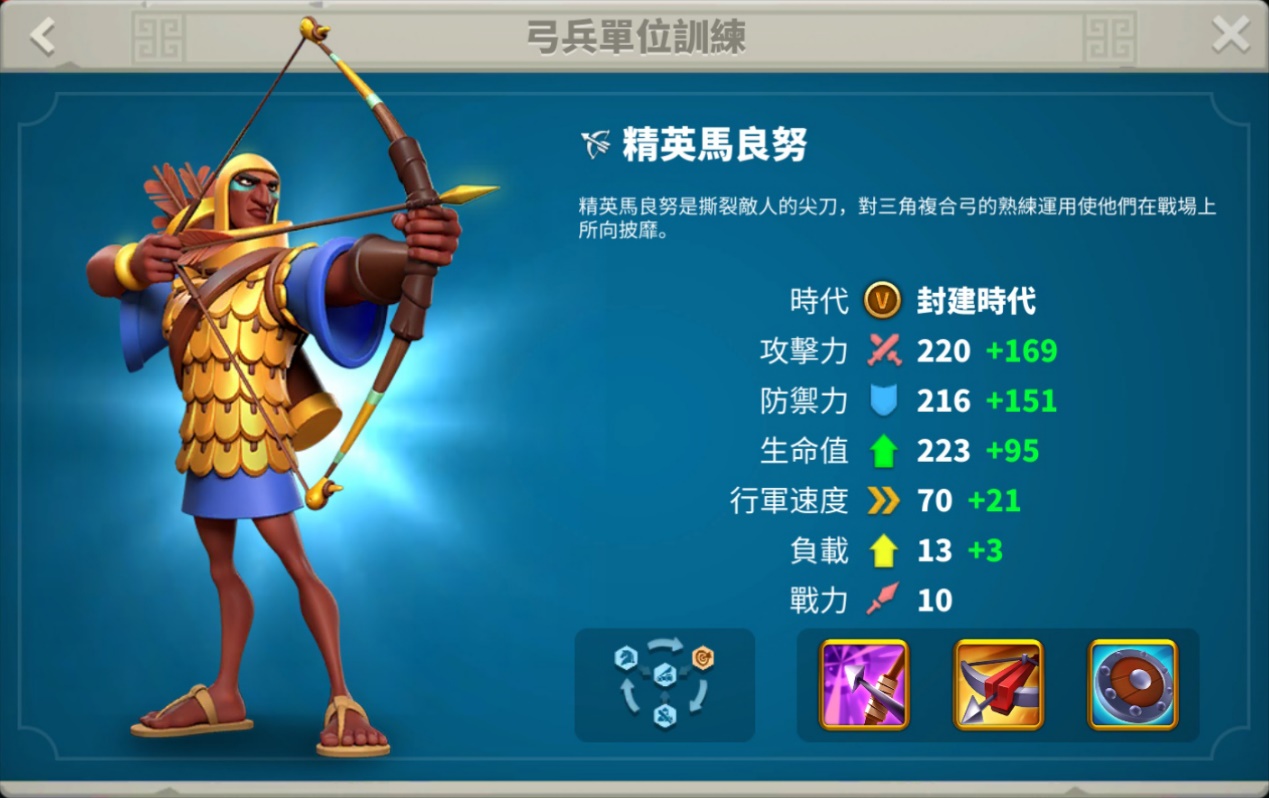 埃及擁有專屬文明加成「尼羅河的恩典」,可提升弓兵攻擊力與集結部隊傷害,除此之外,還能增加建造與科技研究速度。埃及文明的靶場可訓練特殊弓兵單位「馬良努」,與文明加成搭配,組織強大的弓箭手部隊吧!