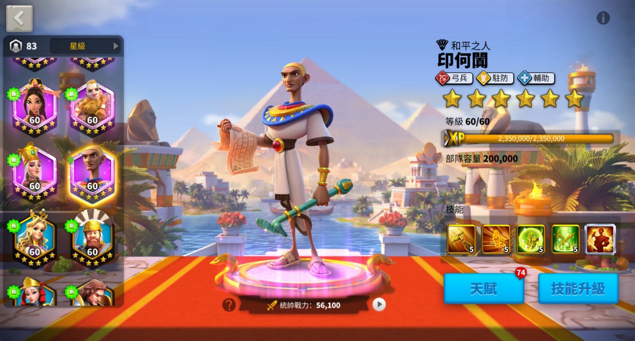 【帝國開拓者】被動技能:所率領的弓兵單位攻擊力提升15%,行軍速度提升10%。在聯盟領土外時,造成的所有傷害提升15%。