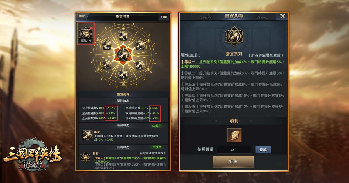 ◆主公可使用「共鳴石」提升靈寶共鳴來獲得新的戰時屬性加成。