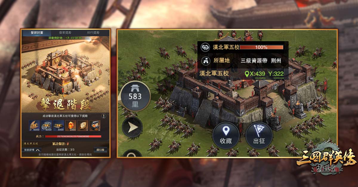 ◆漢北軍五校分為兩個階段,第一階段將其兵力擊退後,協力攻打的主公都可獲得「擊退獎勵」(可獲得靈寶共鳴所需的「共鳴石」);第二階段則是無限兵力,主公可繼續攻打製造高傷害,爭奪排行獎勵。
