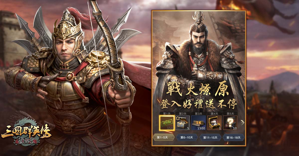 ◆即日起~7/10無論您現在是否還在征戰沙場的新豪傑,或是已經歷經百戰的老戰友,只要您是《三國群英傳-霸王之業》的玩家,透過活動頁登入遊戲帳號,即可領取豪華虛寶序號!千萬不要錯過唷!《三國群英傳-霸王之業》將持續帶來更多新系統、新玩法,期待您一起來共創皇朝霸業!