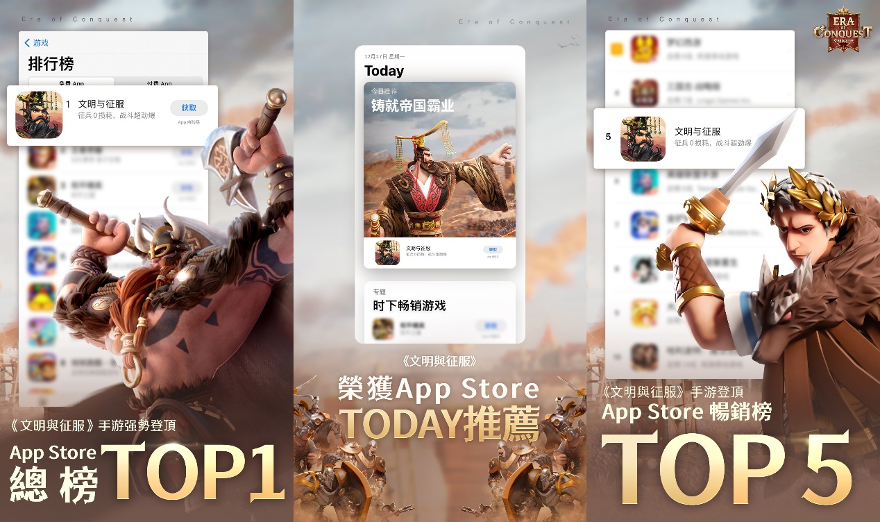 《文明與征服》於2021年12月29日在中國首站發行,短短十天時間便掀起當地「攻城」熱潮,衝上中國區iOS免費榜榜首、暢銷榜TOP 5好成績,並多次成為蘋果今日推薦,其別具特色的策略機制和武將技能組合玩法贏得了百萬玩家的好評。