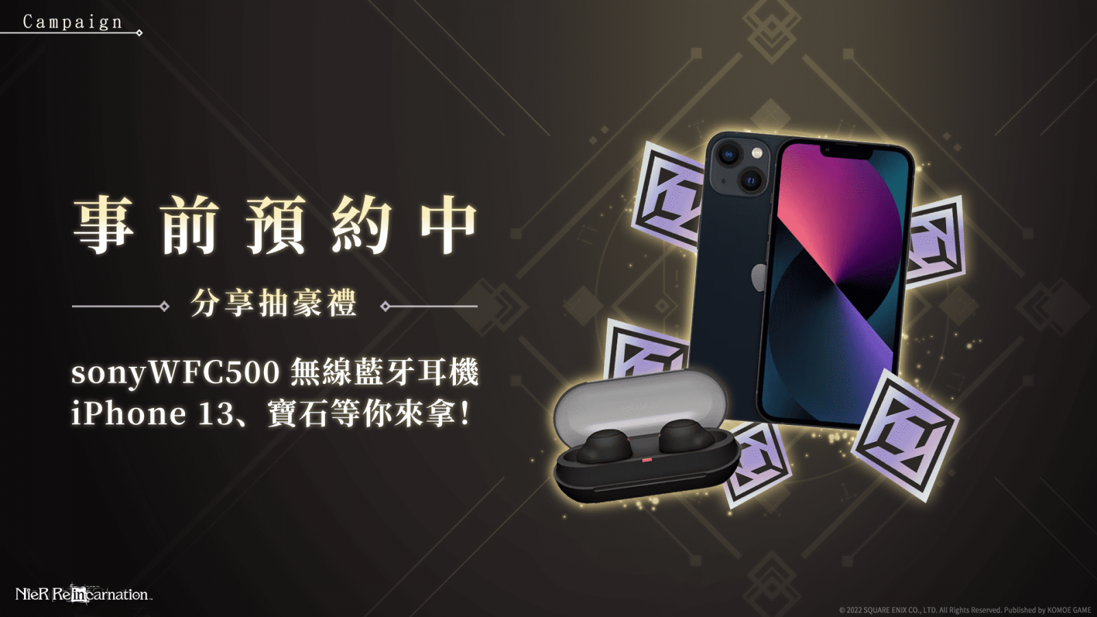 除了遊戲內的獎勵外,在達成各個預約目標達成之際,官方也將祭出多樣社群粉絲團專屬抽獎獎品,包含MyCard點數卡、iPhone13(256G),sony WF-C500無線藍牙耳機,以及多款《尼爾》周邊等多項實體獎勵,等待玩家們參與獲得!