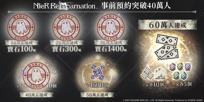 - 預約人數突破40萬獎勵解鎖 官方粉絲團多重好禮活動同步進行中!《NieR Re[in]carnation》事前預約已達40萬人,為了感謝玩家們的熱情參與,本次成功解鎖「1200個寶石」與大量強化素材獎勵!當最終目標達成後,共可獲得免費的4500個寶石(相當於15次轉蛋)、3張高級轉蛋券等更多豪華好禮!