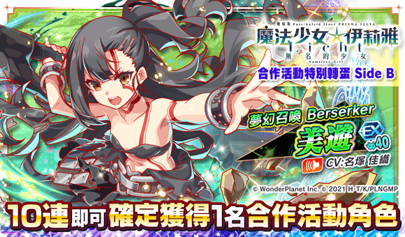 「夢幻召喚 Saber 伊莉雅」與「夢幻召喚 Berserker 美遊」等附有專屬技能語音的合作限定角色,將在合作活動期間限定轉蛋中登場!!