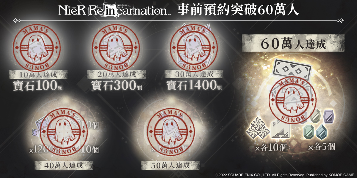 事前預約人數已達60萬目標,包含免費的4500個寶石(相當於15次轉蛋)、3張高級轉蛋券,以及大量強化素材等豪華預約獎勵全數解鎖,待遊戲上線後,玩家只需通過序章劇情即可領取獎勵。