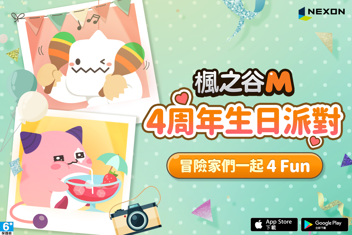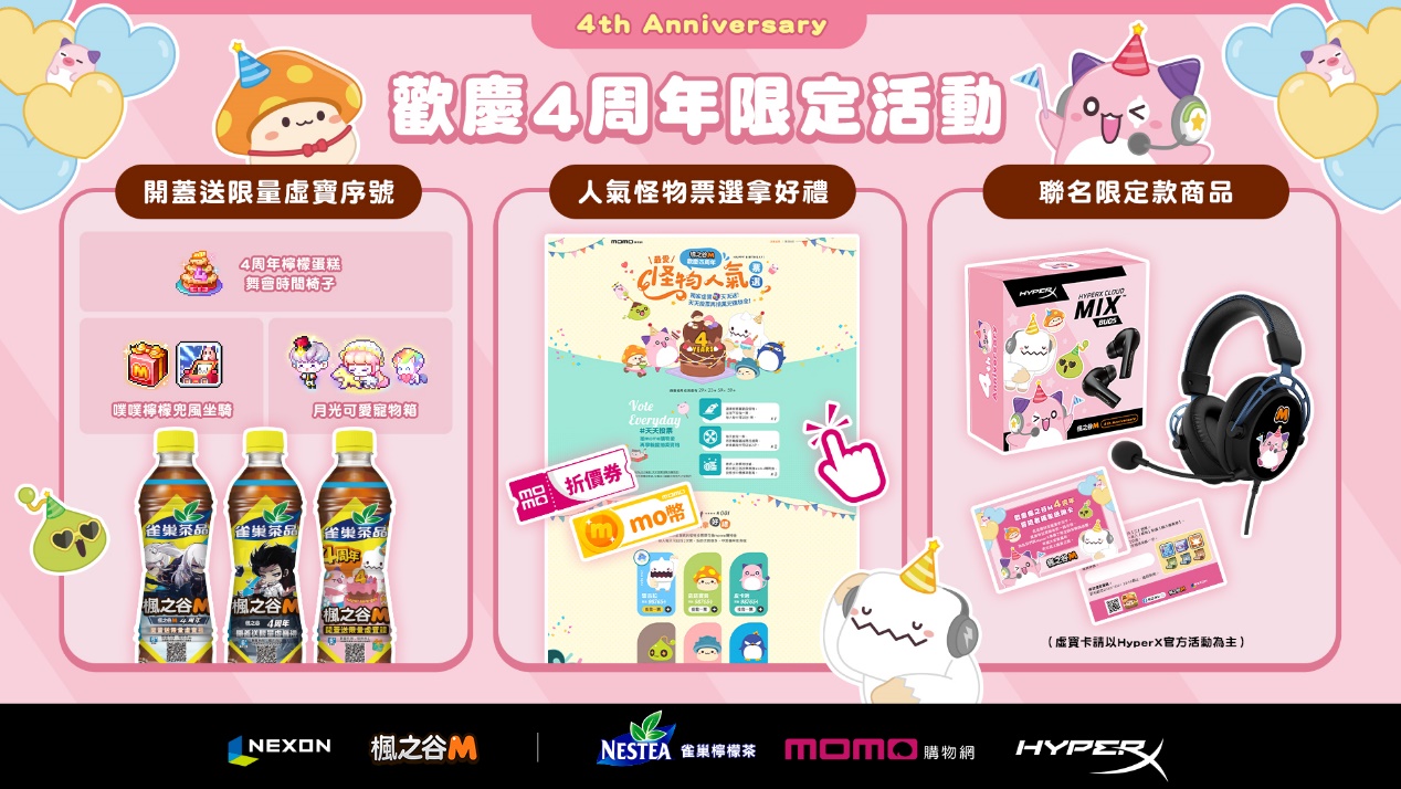 為了感謝所有玩家們的支持與陪伴,《楓之谷M》與「雀巢茶品 、momo購物網、HyperX」攜手共同推出豐富活動,邀請玩家們一同慶祝4歲生日!首波活動率先推出「雀巢檸檬茶」三款聯名限定包裝,即日起至8月31日至全台各大便利商店購買即可有機會開蓋抽到「噗噗檸檬兜風坐騎」、「4周年檸檬蛋糕舞會時間椅子」、「月光可愛寵物」等超值限量虛寶(數量有限,贈完為止)。以及與「momo購物網」聯合舉辦楓之谷M人氣怪物票選活動,7月25日至8月7日有參與投票者將可以獲得虛寶、momo折價券或momo幣等好禮。