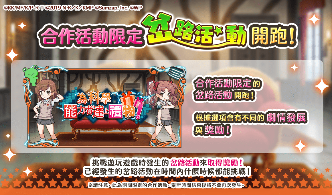 2022年7月29日(五)起,將追加期間限定「為科學能力者們獻上禮物!」岔路活動。在劇情中將會出現選項,根據選項不同,劇情的發展與最終獲得的報酬亦會發生變化。
