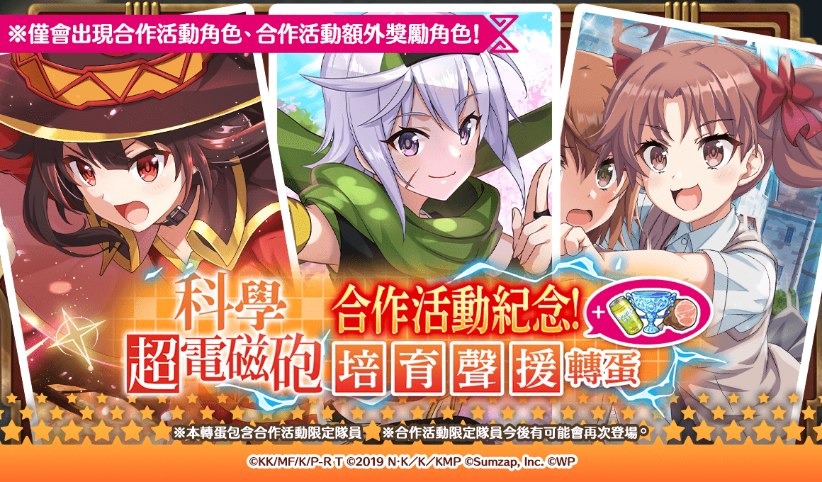 2022年8月3日(三)將舉辦「《科學超電磁砲》合作活動紀念! 培育聲援轉蛋」。本轉蛋中只會出現「御板美琴」、「白井黑子」、「惠惠」、「芸芸」、「愛麗絲」及「克莉絲」,且必定可獲取1位★3以上隊員並額外贈送「椰子汽水×20」、「體力牛肉×5」、「傳說的聖杯×10」的超優惠組合!