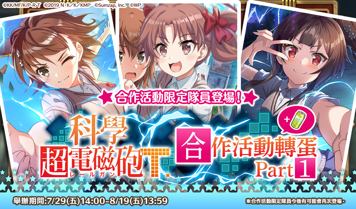 2022年7月29日(五)起,將舉辦「《科學超電磁砲》合作活動轉蛋Part1」。不只是科學超電磁砲的美琴、黑子,美好世界FD的惠惠也將穿著合作活動服裝以★4隊員之姿登場。並且,只要抽取「連抽10次」轉蛋,還可額外獲得獎賞道具「椰子汽水×20」!各位玩家可千萬別錯過這次機會,入手本次的稀有角色喔!
