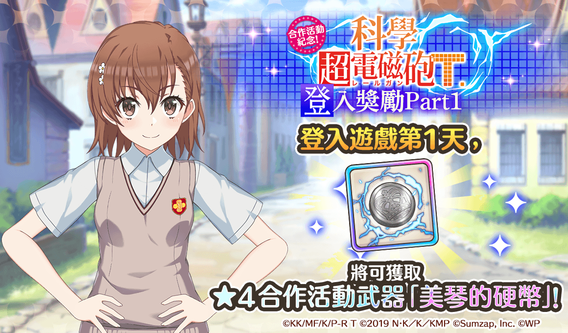 2022年7月19日(二)起,將舉辦「《科學超電磁砲》合作活動紀念登入獎勵Part1」期間限定活動。期間內只要登入遊戲,就能夠免費獲得合作活動武器「美琴的硬幣」和「★4確定轉蛋券」等豪華登入獎勵。現在就開始每天登入遊戲領取獎勵吧!
