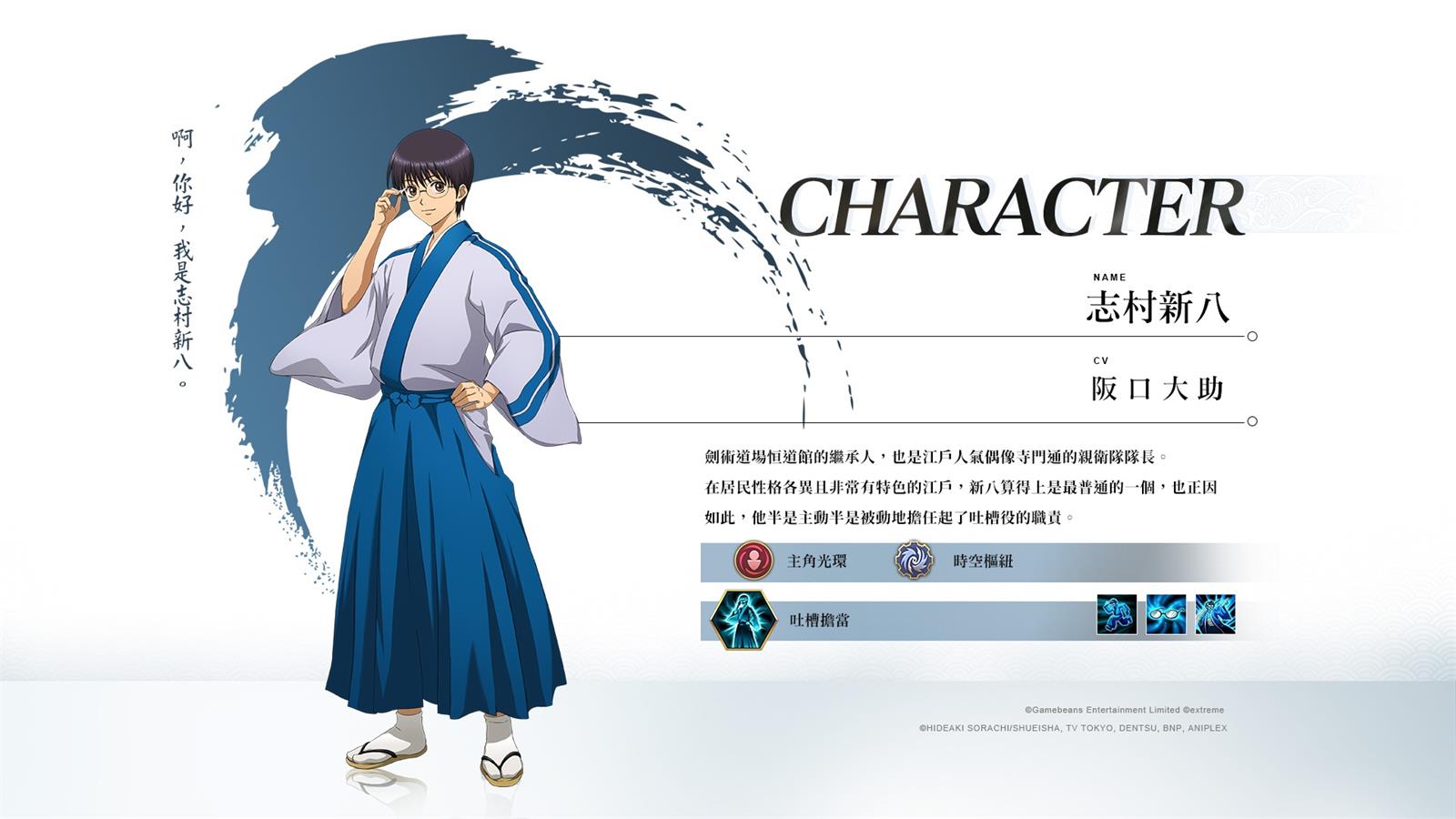 劍術道場恒道館的繼承人,也是江戶人氣偶像寺門通的親衛隊隊長,在居民性格各異且非常有特色的江戶,新八算得上是最普通的一個,也正因如此,他半是主動半是被動地擔任起了吐槽役的職責。眼鏡──不,新八的吐槽本能完美的體現在天賦【吐槽擔當】之上,不僅能弱化周遭的敵人,還能進一步達成激怒的特殊效果,讓他在使用護衛技能「為了阿通!」的時候,更能有效的保護身邊的人,當然更重要的是,保護自己。