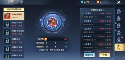 「附靈」系統只要玩家等級達到超凡20級就可以開啟。「附靈」系統屬於裝備強化系統下的額外增強效果,只要消耗指定的道具,玩家就可以盡可能的升級附靈,還可以透過「赤陽之境」或「幽月之境」等關卡進一步的提升裝備能力。