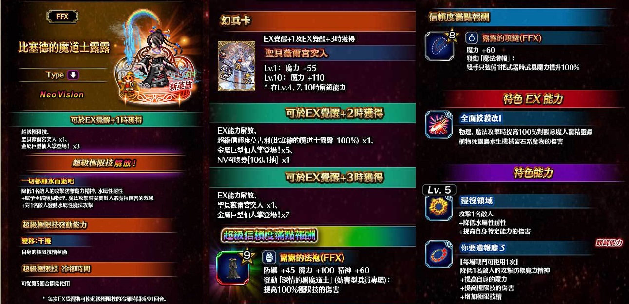 歡迎來自《FFX》的全新兵員們!擁有CG極限技的『新人護衛提達』,以及『比塞德的魔道士露露』已經踏上冒險的征途,立即透過新的精選召喚,邀請這兩位期間限定兵員加入您的隊伍!此外,將『新人護衛提達』覺醒至EX+3時,可獲得幻兵卡「不是最後……而是永遠」;而將『比塞德的魔道士露露』覺醒至EX+1及EX+3時,可獲得幻兵卡「聖貝薇爾宮突入」。