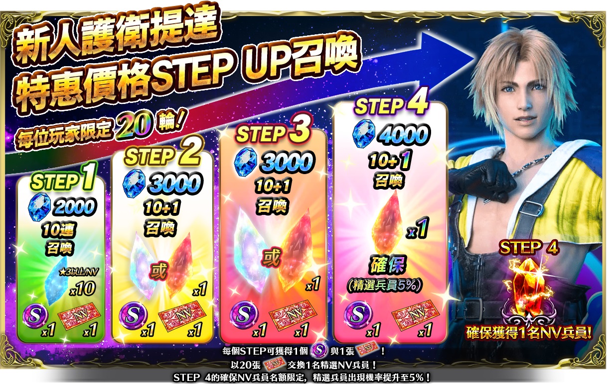即日起至9/22活動時間結束止,玩家可透過「新人護衛提達特惠價格STEP UP召喚」,於STEP 4確保獲得1 名NV兵員!。