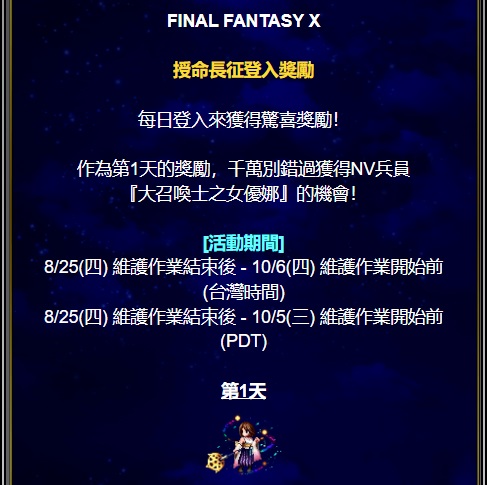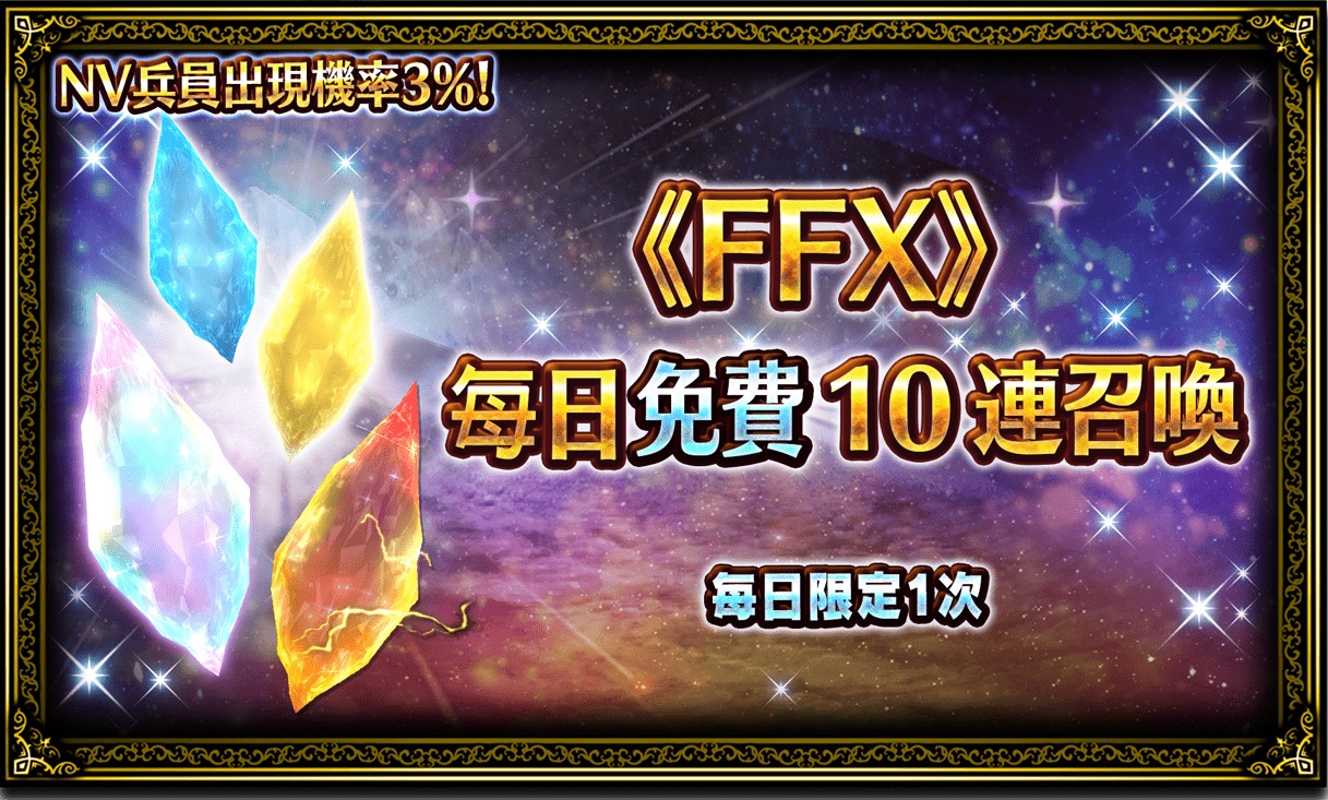 - 「《FFX》每日免費10連召喚」:即日起至9/22活動時間結束止,玩家們可以每日進行1次召喚,最多可獲得420連免費召喚,每週將更新召喚池,此召喚列表僅包含每週活動前加入遊戲內的特定兵員,不包含期間限定與合作兵員。