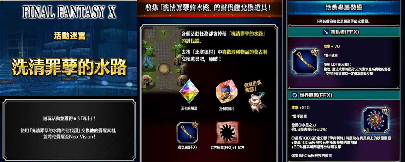- FFX活動迷宮「洗清罪孽的水路」:即日起至9/22活動時間結束止,玩家只要完成各任務中的挑戰,並獲得活動道具討伐證,就可以跟莫古利王交換驚喜的活動報酬,包含雙手武器「復仇者(FFX)」等活動專屬裝備! 此外還可交換到『瓦卡』的超級信賴度滿點報酬「世界冠軍(FFX)」強化所需的配方素材。