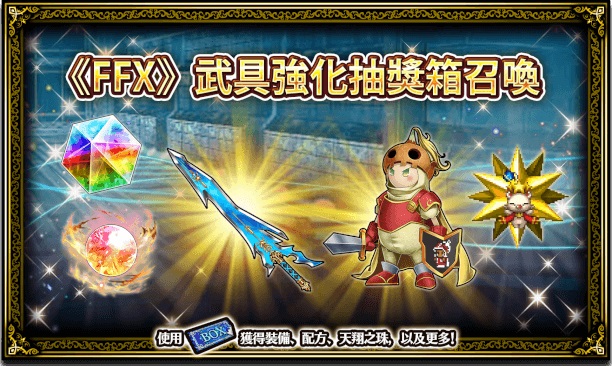 - 「《FFX》武具強化抽獎箱召喚」:即日起至9/29活動時間結束前,透過參與特定活動完成「《FINAL FANTASY X》特別任務」與「《FINAL FANTASY X》特別任務II」,以獲得「《FFX》武具強化抽獎箱召喚券」!使用「《FFX》武具強化抽獎箱召喚券」進行「《FFX》武具強化抽獎箱召喚」,將有機會獲得裝備「最終究極武器(FFX) 」、「洋蔥騎士(FFX)」,以及強化這些裝備所需的配方素材。