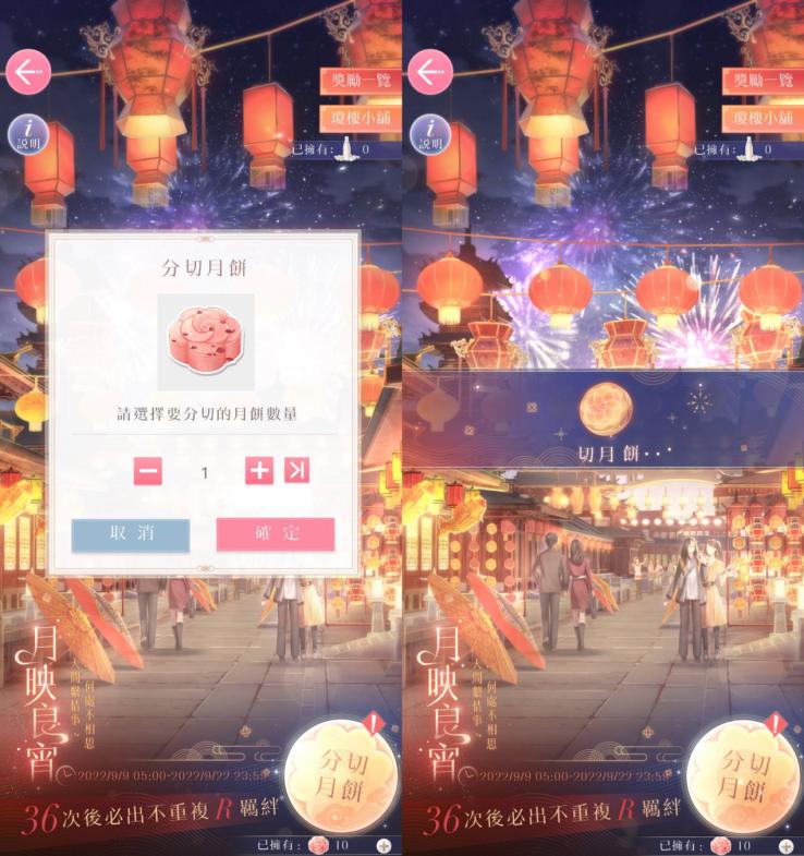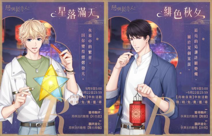 一起親手製作一盞燈,在中秋來臨時,點亮屬於彼此的團圓。9月9日起至9月22日止,《戀與製作人》將開啟「月映良宵」活動。玩家只要在活動期間收集「花瓣月餅」並分切,除了必定獲得的「桂花釀」之外,還可隨機獲得「中秋主題R羈絆」、「星河許願券」、「曦光許願券」、「一星課程卡」與「城市暴走卡」等眾多獎勵其中之一。玩家每開啟36次,必定可隨機獲得一張紀念R羈絆。