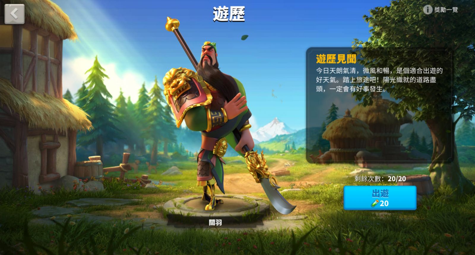 由政務院進入「遊歷」功能,可以和心儀的統帥踏上旅途,消耗行動力出遊,收穫意想不到的驚喜,包括軍器、道具,以及用於升級政務院的賢者之證。提升政務院等級即可增加每日遊歷次數喔!