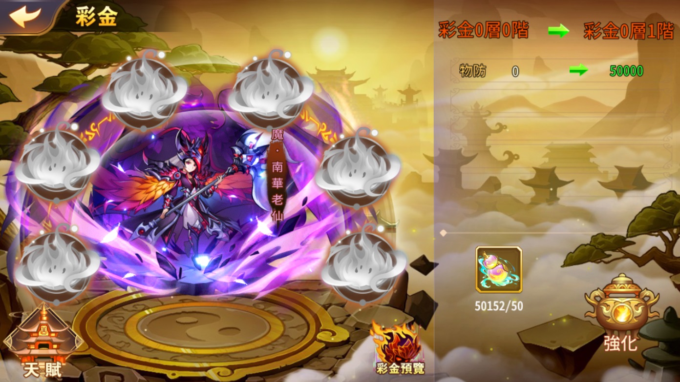 主角等級達 180 級、武將晉升至紫金且進階至 20 階時可以開啟彩金登仙之路。武將升彩金共分為 6 大階,每階有 12 級,玩家須收集「仙葫蘆」晉升,達第 6 與 12級時需額外收集「龍魂涎」進行突破,這兩項登仙道具都可在魔窟商店中兌換取得。