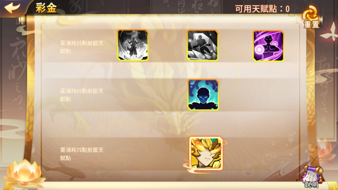 武將培養彩金過程時可獲得屬性和全體屬性加成,並獲得一定數量的天賦點。每個武將的最終天賦各有其特色,使用天賦點可為武將選擇不同培養路線,獲得各式加乘效果,天賦點可重置,方便玩家嘗試多種搭配組合,找出最適合自己的玩法。