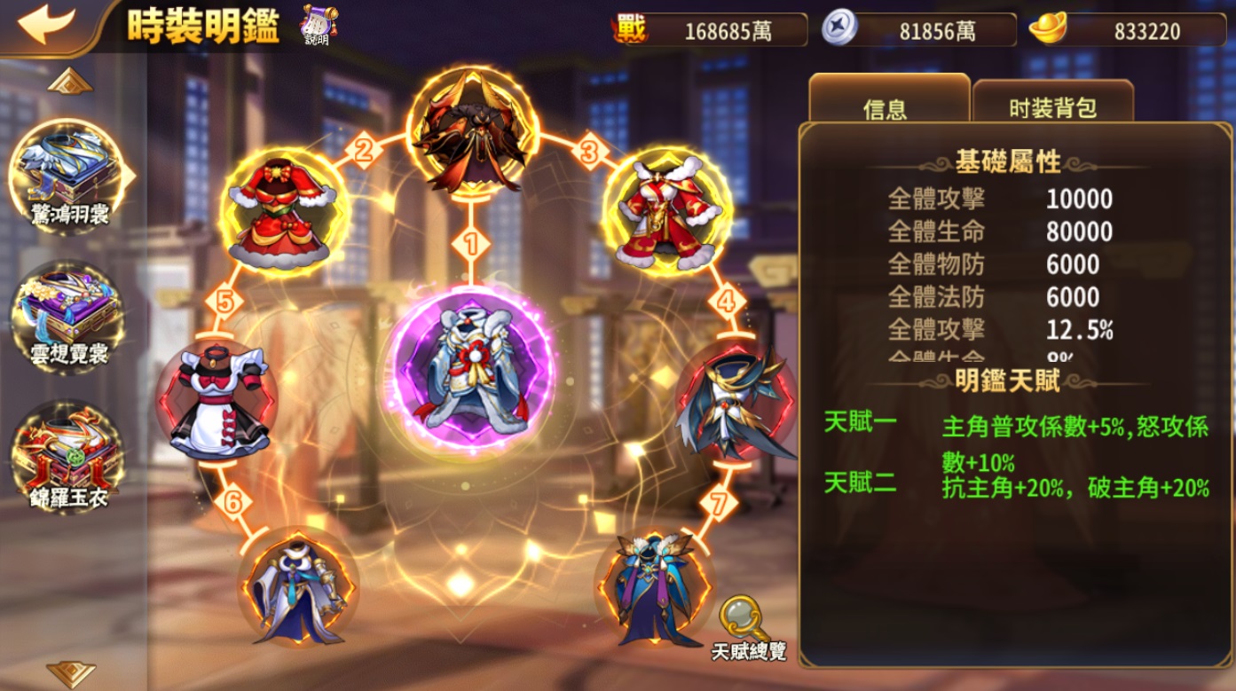 時裝加成再升級,時裝明鑑提供時裝新去處!玩家可將橙、紅、金、暗金與紫金品質時裝收藏於時裝明鑑組合中,提供槽位加成、連線加成和明鑑天賦等屬性。每件時裝只能置入一項明鑑組合,置入對應品質時裝後啟動該欄位並獲得全體屬性加成,相鄰欄位啟動後還可獲得連線加成,每個明鑑組合都有2個天賦,完成指定數量欄位即可觸發。時裝明鑑有多種組合,不同明鑑組合的屬性和天賦可同時生效。