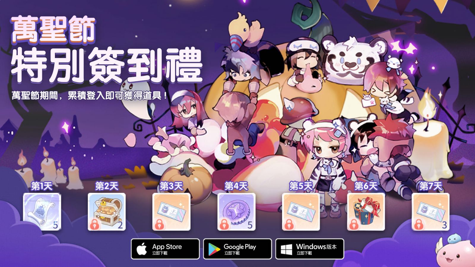 ③萬聖節七日簽到活動(10/24——11/07):完成七日簽到,共可領取普通召喚券*5、銅幣寶箱*2、紫星幣*5、公會獎牌箱*1、扭蛋抽獎券*5。
