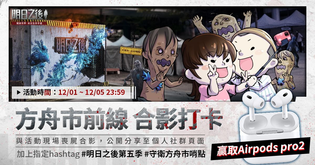 活動現場還安排了豐富的闖關遊戲,倖存者可深入體驗蒐集「異變核芯」、改造武器、擊敗畸變喪屍的過程,參與即可獲得末日風格週邊獎勵、遊戲虛寶!另外,與現場的喪屍Coser合照,公開分享至個人社群頁面並加上活動指定hashtag,更有機會抽中Airpods pro2、小米行動電源、MyCard1000點等獎勵。歡迎倖存者們號召身邊夥伴一起出發,與我們共同守衛前線,探查方舟市背後的秘密!