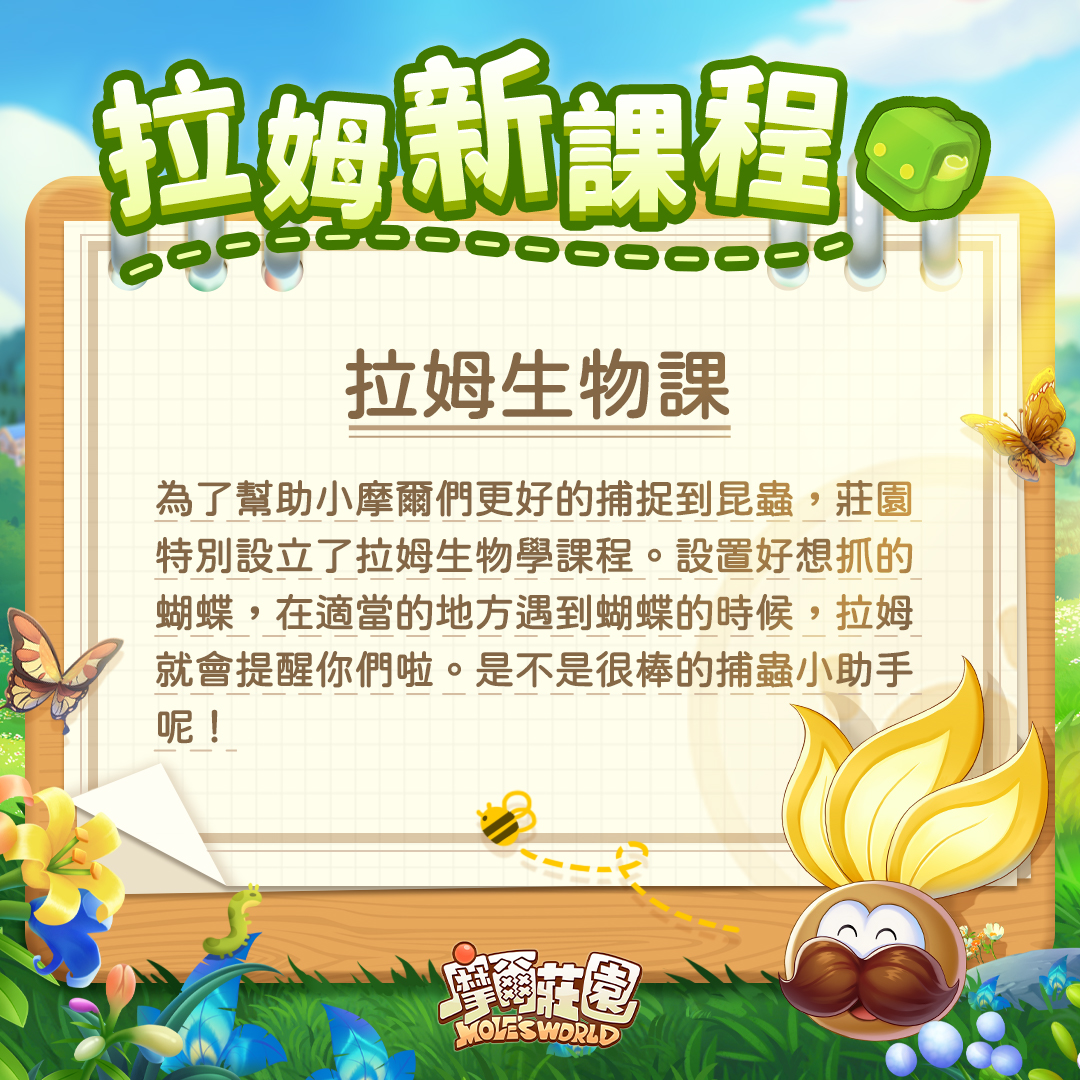 科研課面向想要學習植物學的小拉姆,可以學習更多植物授粉的相關知識。生物學課程則是為了幫助小摩爾們更好的捕捉到昆蟲,設置好想抓的蝴蝶,在適當的地方遇到蝴蝶的時候,拉姆就會提醒你們啦。