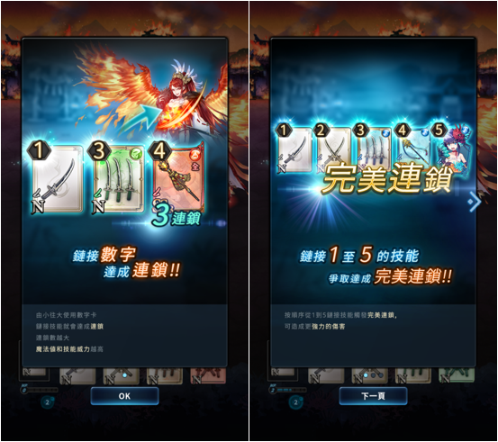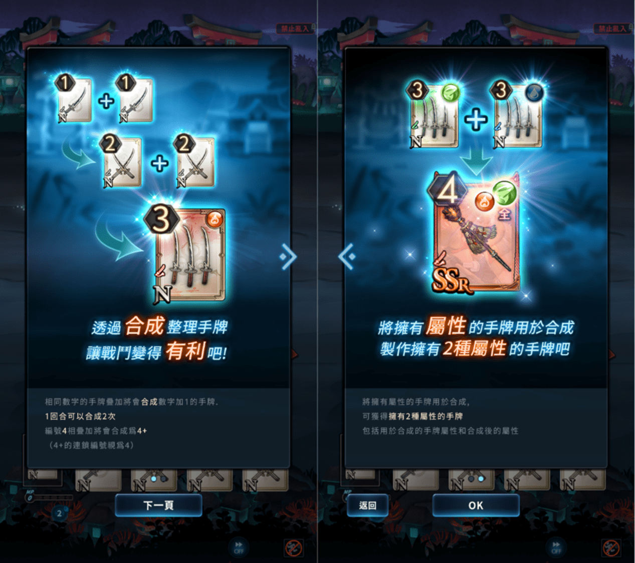 而當場上沒有連續數字的手牌時,玩家可以選擇將相同數字的手牌合成,例如兩張數字1手牌,可以合成為數字2手牌,讓戰鬥變的更具策略性,此外合成具有屬性的手牌時,合成後的手牌將具有兩種不同的屬性,靈活運用將可以更快速擊破敵人的屬性弱點。